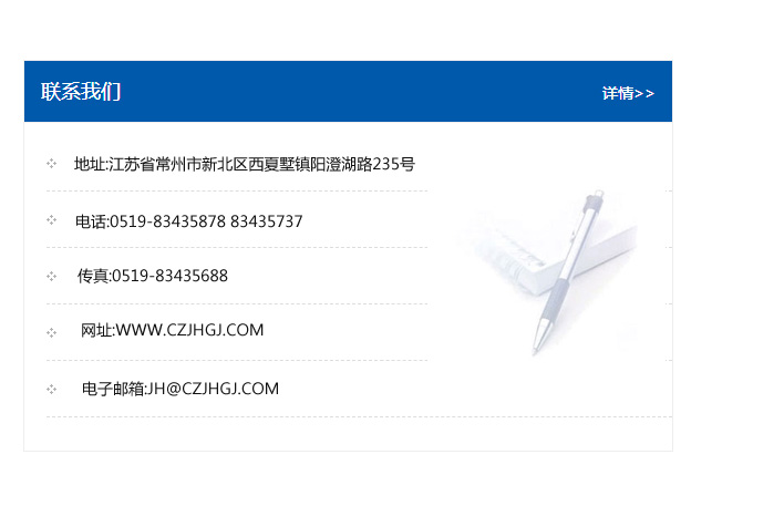 地址:常州市新北區友邦商務大廈1幢16、17層  電話:0519-85101652  傳真:0519-85112595  郵編:213022  網址:www.cz-jiayue_cn.whjzdmy.com  郵箱:xiajifengaa@163.com
